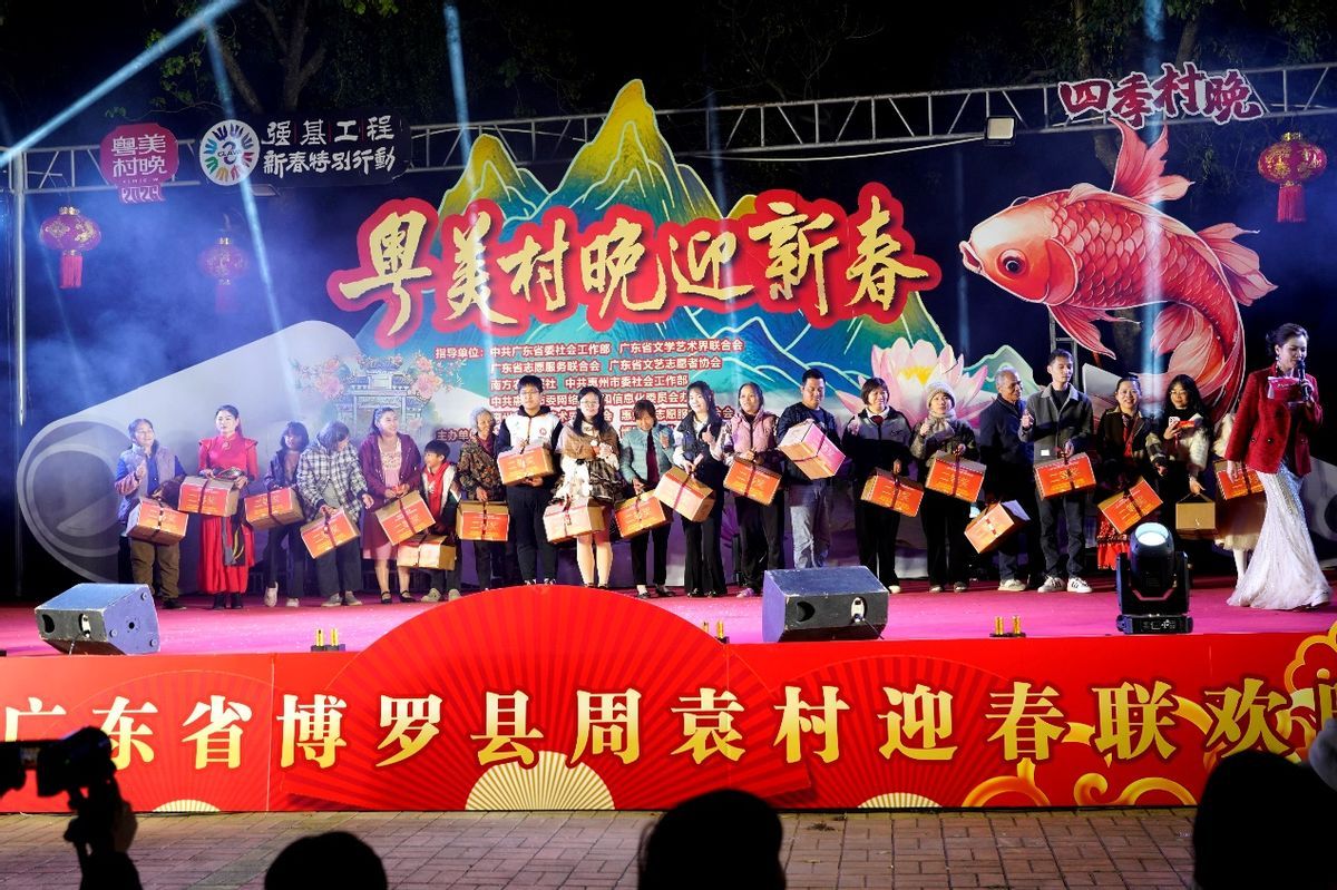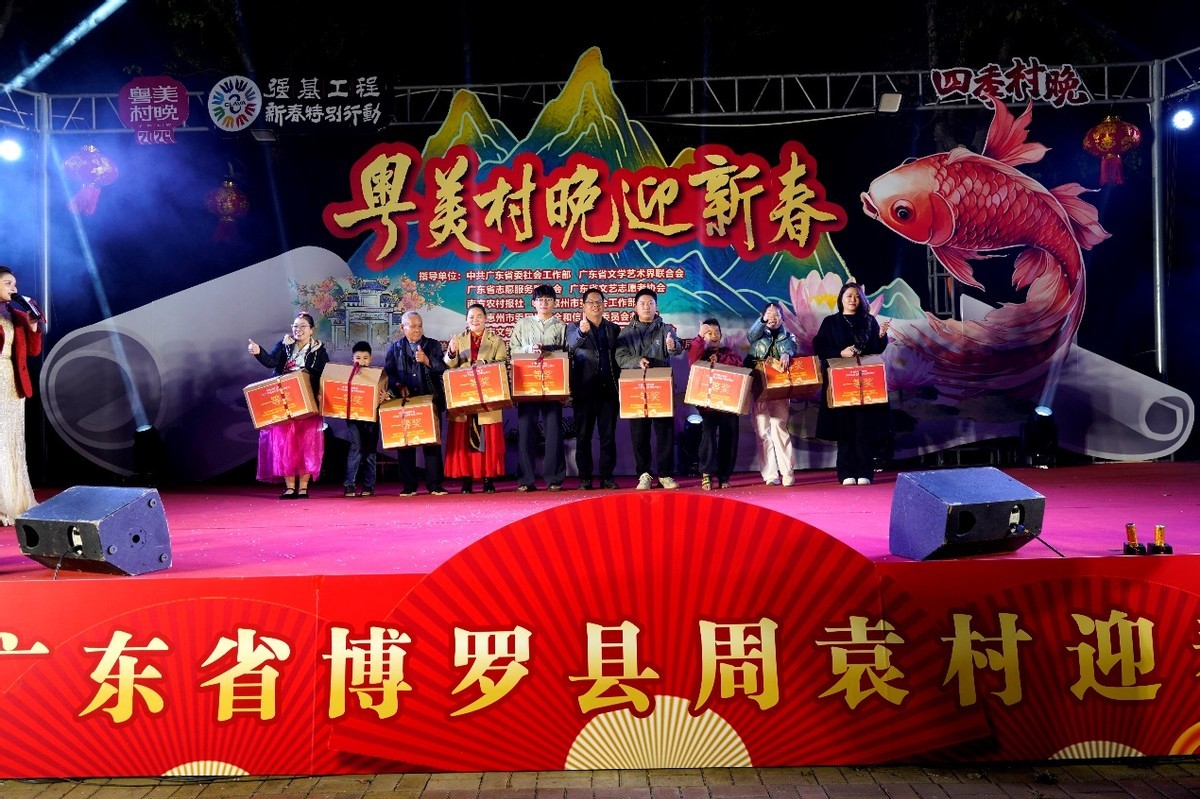 春临罗浮,福满乡村。2月8日晚,惠州市博罗县长宁镇周袁村文化广场灯火通明、欢声如潮。“粤美村晚迎新春”——广东省文艺志愿服务“百千万工程”暨2026年周袁村春节联欢晚会在这里热烈上演。一场由村民自编自导、自演自赏的乡村文化盛宴,在熟悉的乡音与热烈的掌声中,拉开丙午新春的温暖序幕。